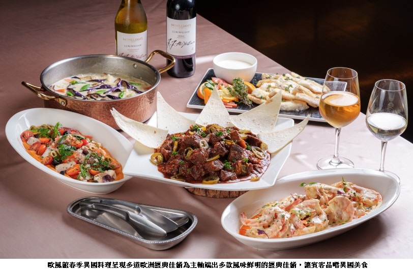 歐風館春季異國料理呈現多道歐洲經典佳餚為主軸,讓賓客品嚐異國美食,用味蕾就能環遊世界;本季推出的新菜包括法式紅油白醬燉蝦,主廚以紅油與白醬交織出濃郁滑順的醬香,襯托鮮蝦的彈嫩鮮甜;忌廉風味燉雞,雞肉的肉質細嫩,佐以柔潤的奶香,展現歐陸家常料理的溫暖層次。