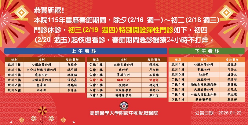 春節期間醫療服務不中斷 高醫加開彈性門診與傳染病特別門診 守護民眾健康
